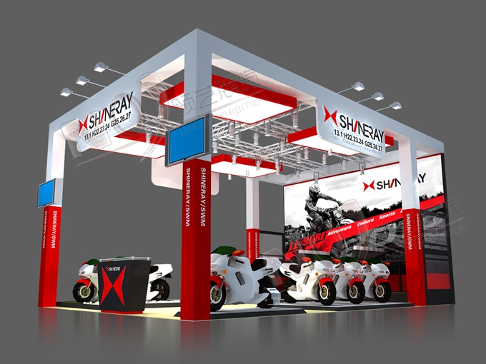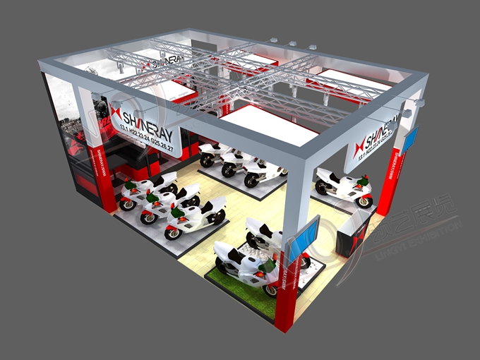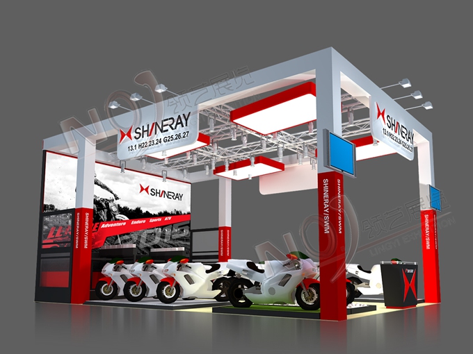 契合鑫源摩托的品牌形象和產(chǎn)品特性,采用矩形結(jié)構(gòu),再搭配燈具燈光的效果,襯托出展位簡約、時(shí)尚的氛圍,突出一種現(xiàn)代、簡約的時(shí)尚品味。
