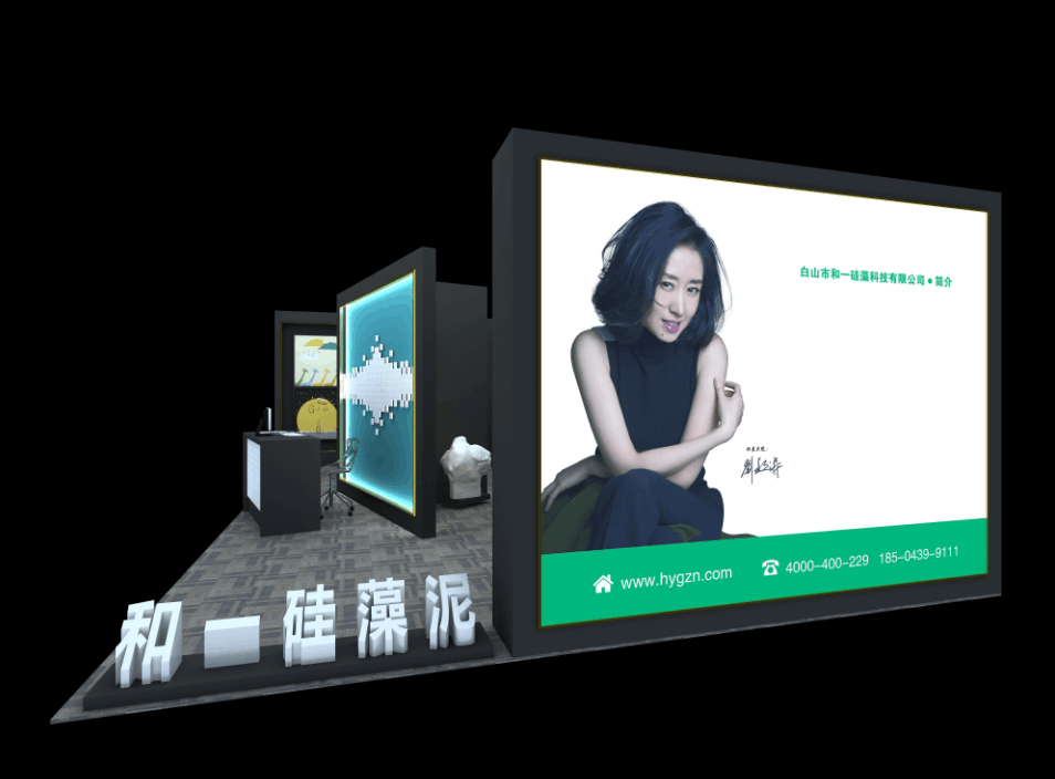 契合和一硅藻泥的品牌形象和產(chǎn)品特性,利用黑色突出產(chǎn)品,再搭配燈具燈光的效果,襯托出展位現(xiàn)代、突出一種現(xiàn)代、高端的時(shí)尚品味。