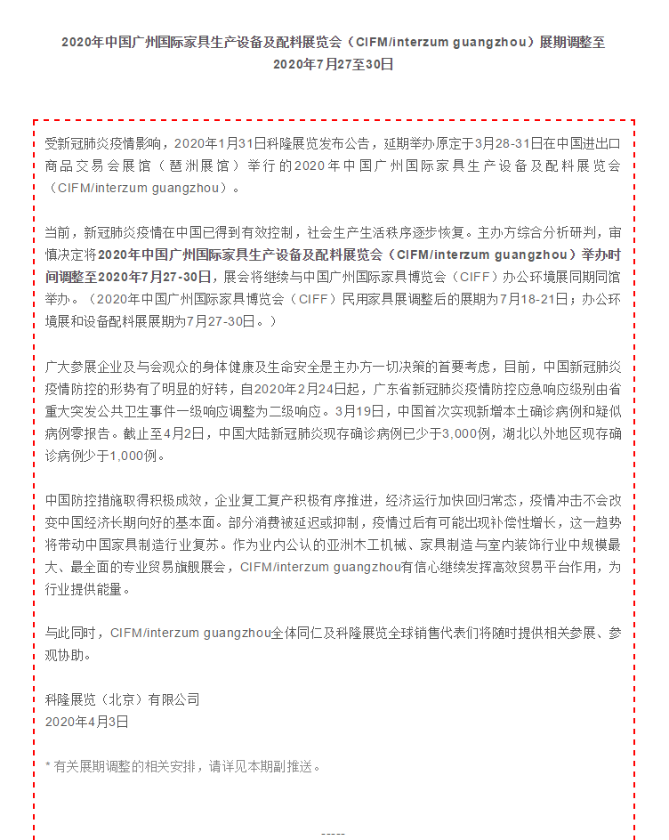 根據(jù)家具展設(shè)計(jì)搭建公司領(lǐng)藝展覽了解到,2020年中國廣州國際家具生產(chǎn)設(shè)備及配料展覽會(CIFM/interzum guangzhou)舉辦時(shí)間調(diào)整至2020年7月27-30日,展會將繼續(xù)與中國廣州國際家具博覽會(CIFF)辦公環(huán)境展同期同館舉辦。(2020年中國廣州國際家具博覽會(CIFF)民用家具展調(diào)整后的展期為7月18-21日;辦公環(huán)境展和設(shè)備配料展展期為7月27-30日。)如需家具展設(shè)計(jì)請聯(lián)系領(lǐng)藝展覽,希望我們能在家具展搭建上為您添磚加瓦,祝各位朋友收獲多多,滿載而歸!