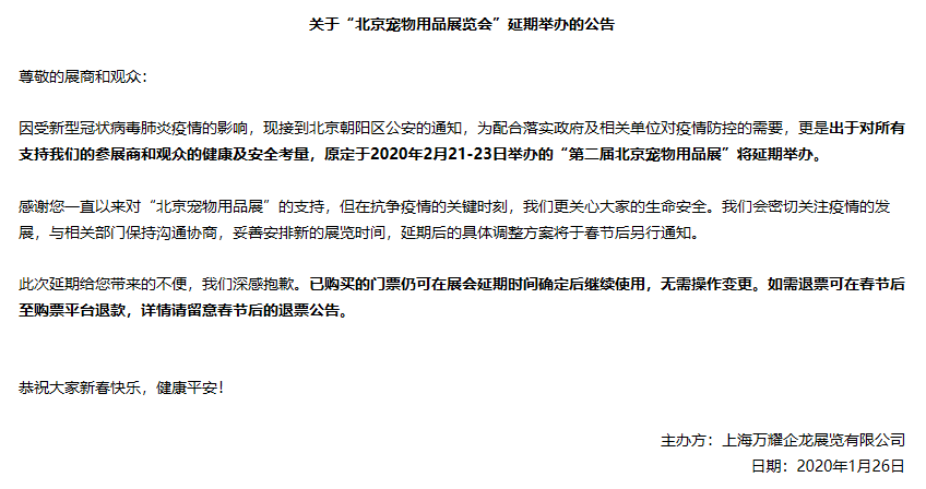 根據(jù)北京寵物展設(shè)計(jì)搭建公司領(lǐng)藝展覽了解到,因受新型冠狀病毒肺炎疫情的影響,主辦方為配合落實(shí)政府及相關(guān)單位對(duì)疫情防控的需要,更是出于對(duì)所有支持我們的參展商和觀眾的健康及安全考量,原定于2020年2月21-23日舉辦的“第二屆北京寵物用品展”將延期舉辦。如需北京寵物展設(shè)計(jì)請(qǐng)聯(lián)系領(lǐng)藝展覽,希望我們能在北京寵物展搭建上為您添磚加瓦,祝各位朋友收獲多多,滿(mǎn)載而歸!