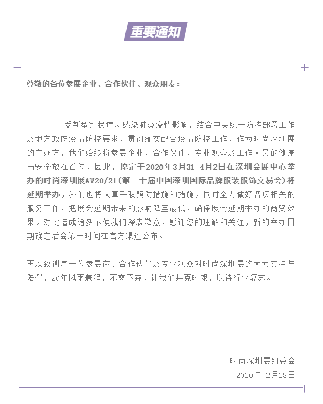 根據(jù)時尚深圳展設(shè)計(jì)搭建公司領(lǐng)藝展覽了解到,受新型冠狀病毒感染肺炎疫情影響,結(jié)合中央統(tǒng)一防控部署工作及地方政府疫情防控要求,貫徹落實(shí)配合疫情防控工作,作為時尚深圳展的主辦方,我們始終將參展企業(yè)、合作伙伴、專業(yè)觀眾及工作人員的健康與安全放在首位,因此,原定于2020年3月31-4月2日在深圳會展中心舉辦的時尚深圳展AW20/21(第二十屆中國深圳國際品牌服裝服飾交易會)將延期舉辦,我們也將認(rèn)真采取預(yù)防措施和措施,同時全力做好各項(xiàng)相關(guān)的服務(wù)工作,把展會延期帶來的影響降至最低,確保展會延期舉辦的商貿(mào)效果。對此造成諸多不便我們深表歉意,感謝您的理解和關(guān)注,新的舉辦日期確定后會第一時間在官方渠道公布。如需時尚深圳展設(shè)計(jì)請聯(lián)系領(lǐng)藝展覽,希望我們能在時尚深圳展搭建上為您添磚加瓦,祝各位朋友收獲多多,滿載而歸!